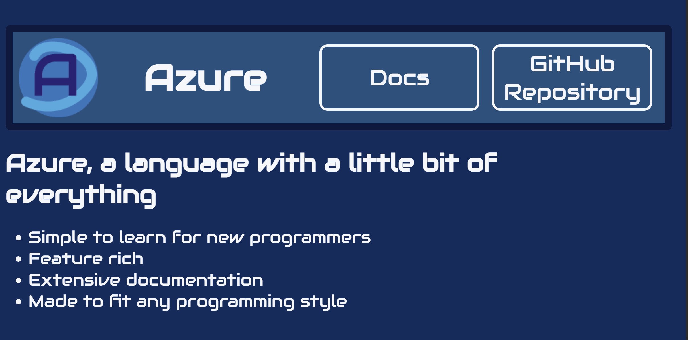 Azure is a programming language I made in Rust to be practical and simple, unlike my previous attemps this one I consider successful and has many features. The main one of which is its mutli-paradigm structure where the language can be customized to fit your coding style, object oriented, interpretive, compiled, dyanmic or static types, etc. It is still in development but so far as been going well. I have learned alot from making Azure and hope to release it soon.