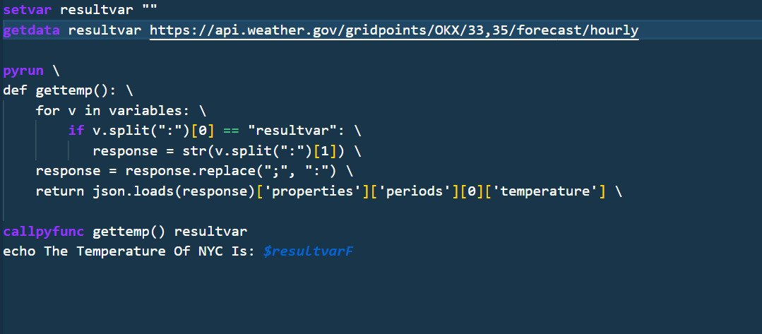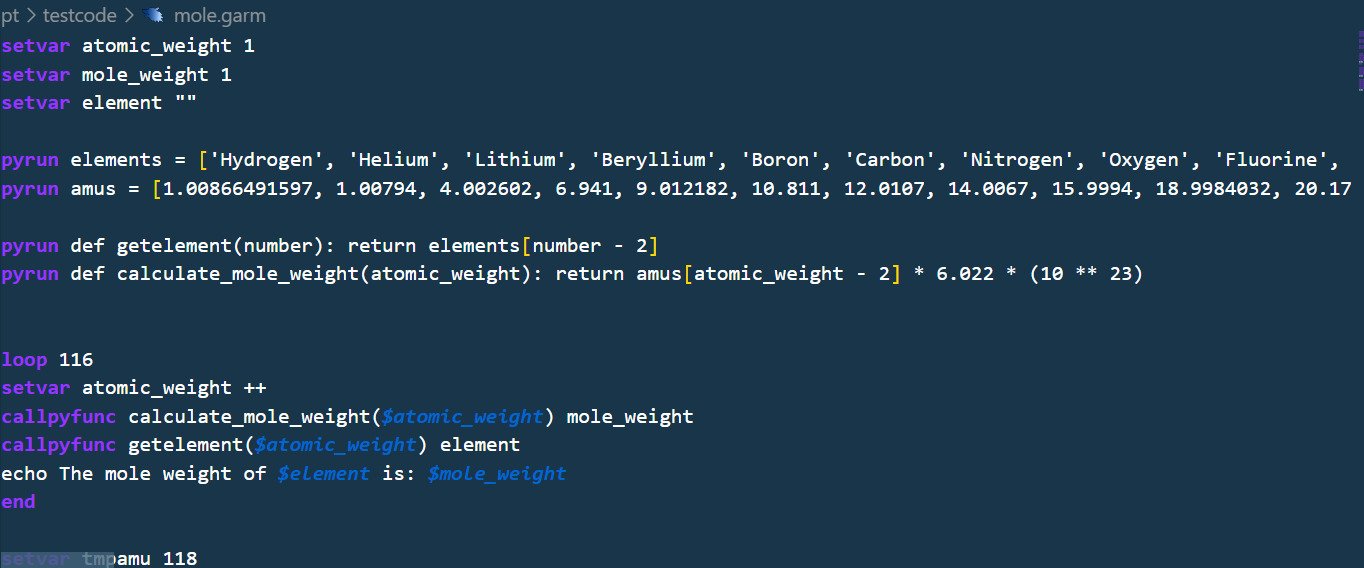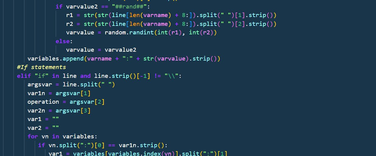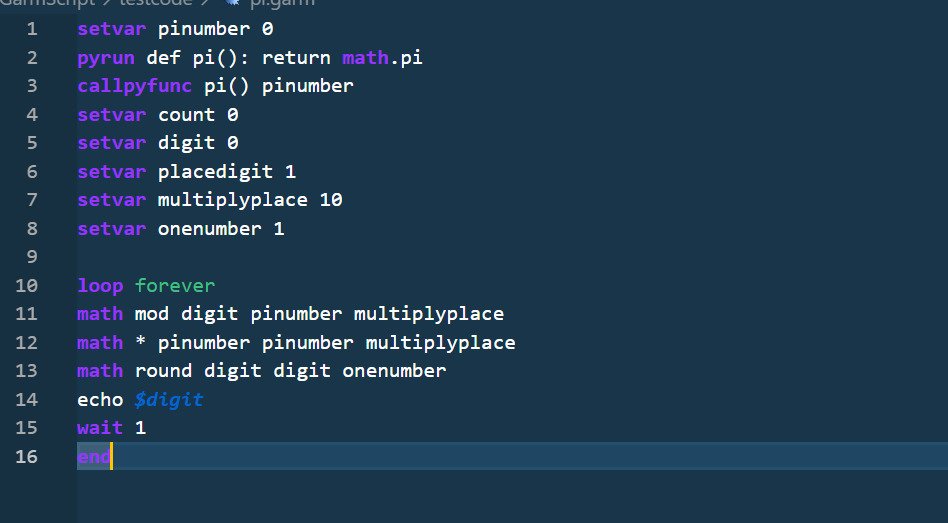GarmScript was a project I made to learn about how programming languages work, it is written from scratch in Python and while not very good it was a great learning experience that helped with many of my future projects, including more programming languages better than the first. GarmScript can run python inside of it, has simple syntax, and has many built in functions. It was a challenge to make as it was my first programming language, but an enjoyable challenge.